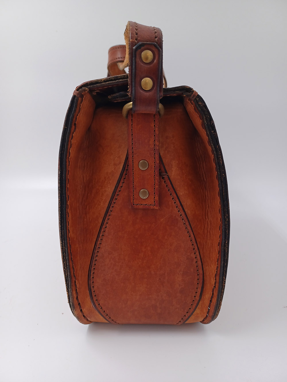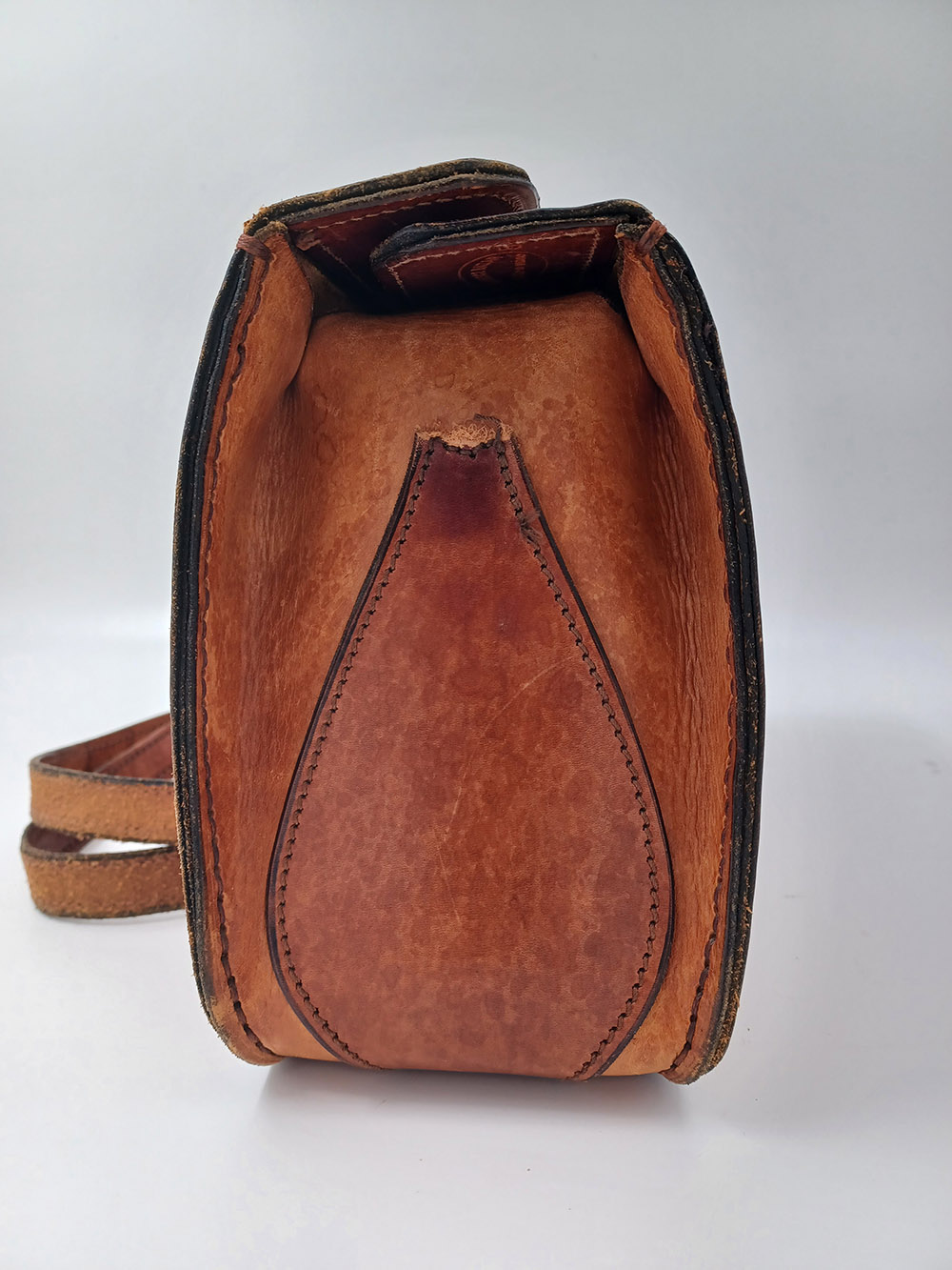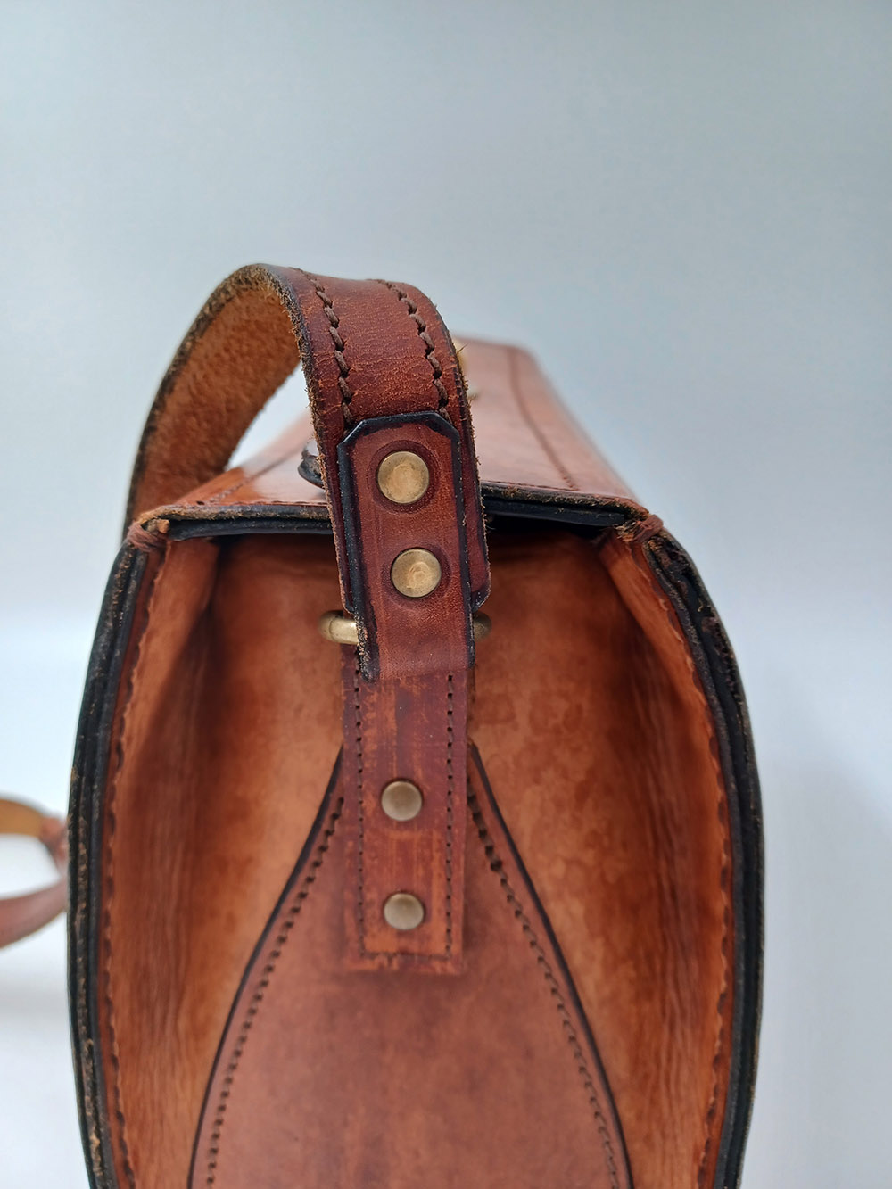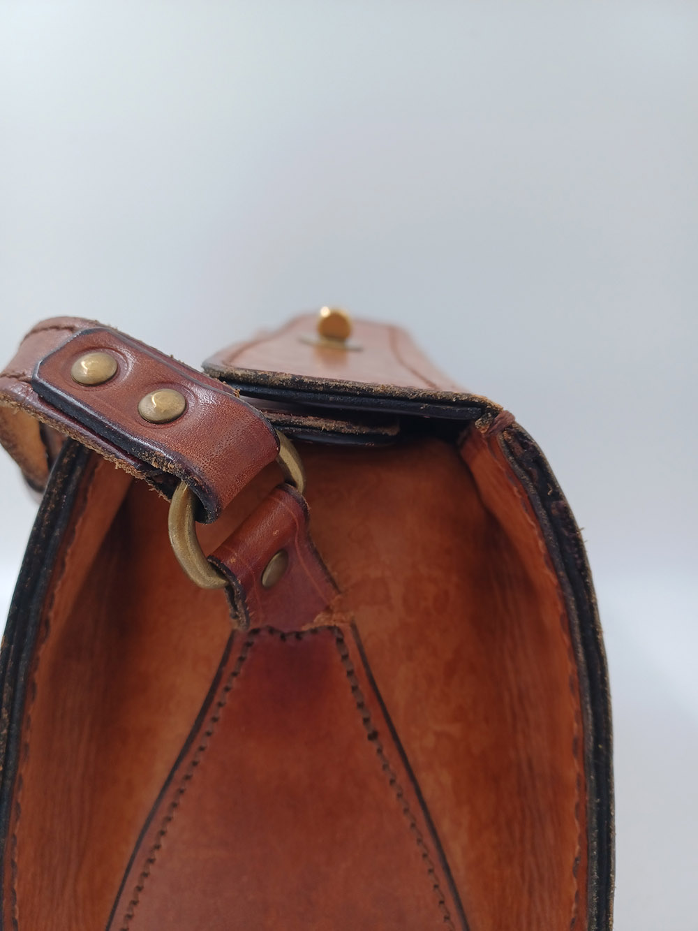 Bij dit tasje was het lusje voor de schouderband aan één kant volledig afgescheurd en aan de andere kant bijna. Het was niet mogelijk om de lusjes op dezelfde manier met behulp van stiksels op de tas te bevestigen. Daarom heb ik gekozen voor een andere manier van bevestigen die zo goed mogelijk paste bij de stijl van het tasje. Dat is gebeurd met holnieten of studs. De stiksels op de lusjes zijn puur voor de sier en hebben geen functie.